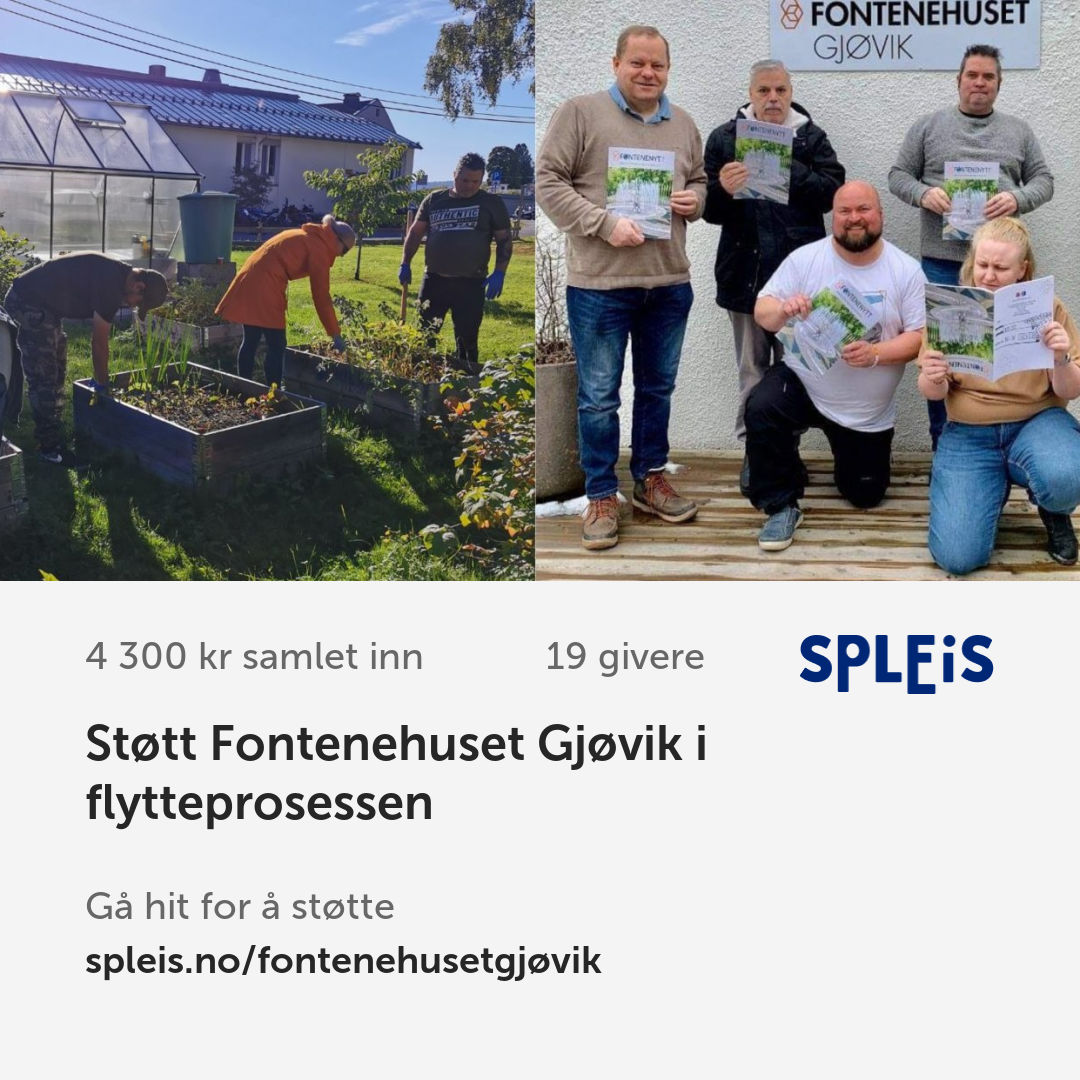 Fontenehuset Gjøvik er avhengig av støttespillere utenfra slik at vi kan fortsette det svært viktige arbeid med å bidra til at mennesker med psykiske helseutfordringer får et bedre og mer meningsfullt liv.